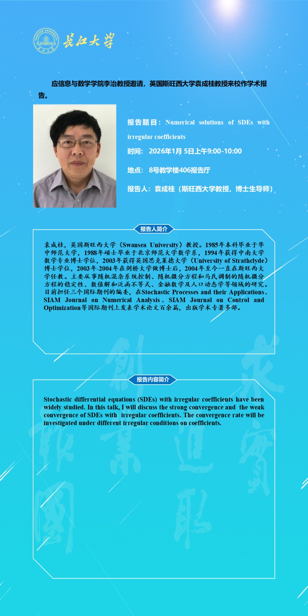 报告人 袁成桂(斯旺西大学教授、博士生导师) 报告时间 2026年1月5日上午9:00-10:00